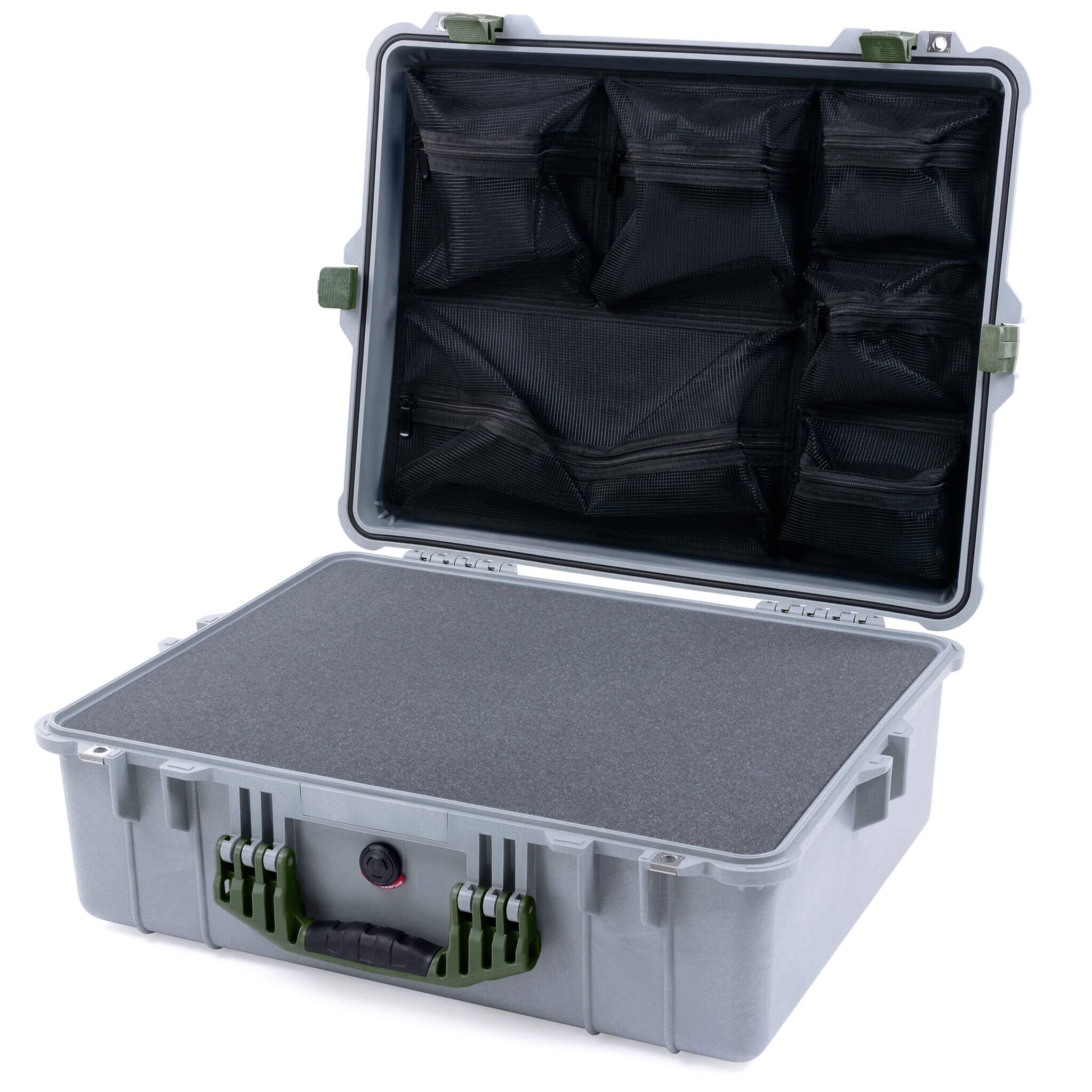 Pelican 1600 Case, Silver with OD Green Handle & Latches